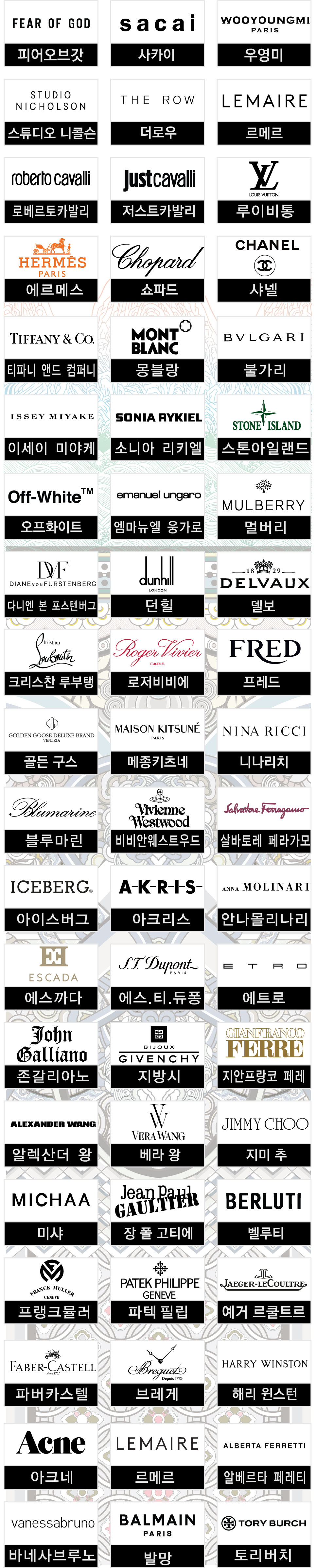 랑콤, 도나캐런뉴욕, 닐바렛, 넘버21, 아랑게운트죄네, iwc 샤프하우젠, 프랭크뮬러, 파텍 필립, 예거 르쿨트르, 블랑팡